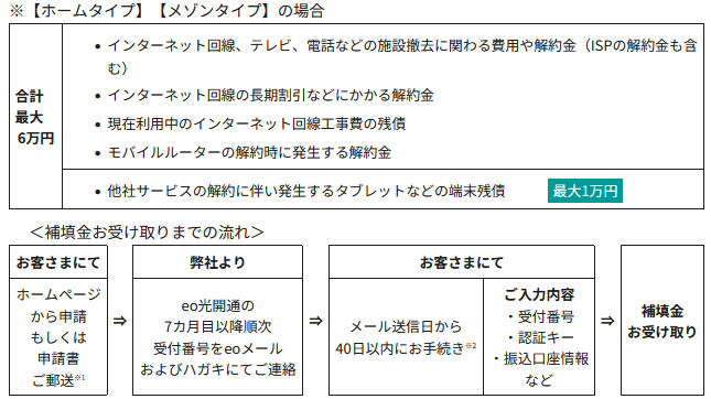 その他注意事項 ・当該eo光ネットにお申し込みの時点で他社サービスを解約されている場合は、他社違約金補填の対象外となります。